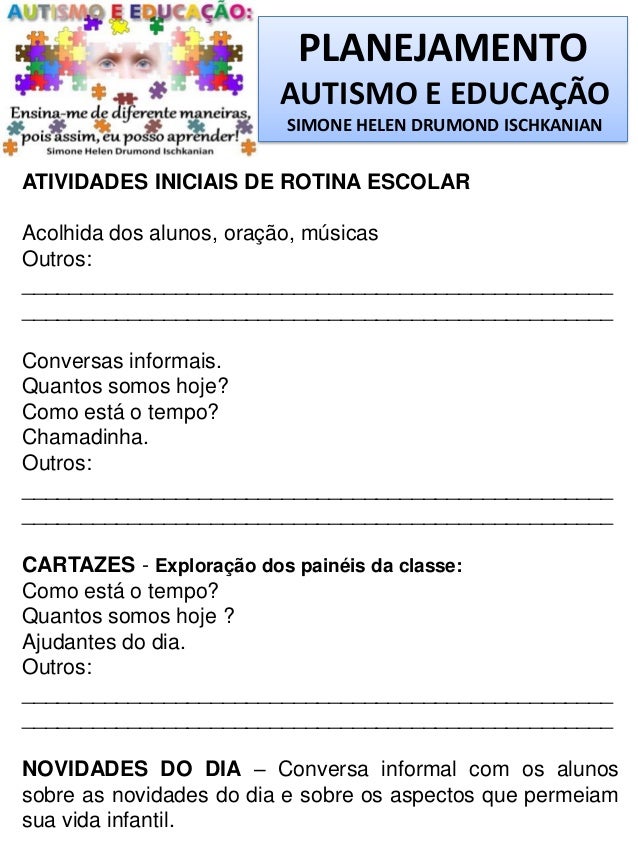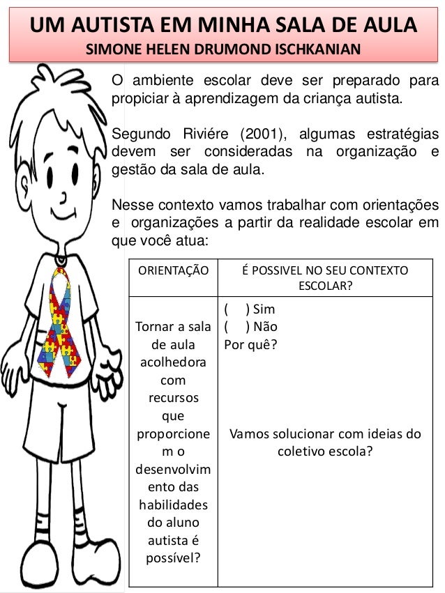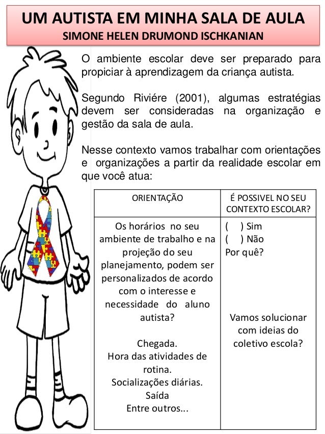 Passeando pela internet fui encontrando atividades e definições para o AUTISMO e resolvi postar as que achei mais interessantes. São apenas sugestões para que possamos ir nos apropriando a cada dia um pouquinho sobre o tema, pois não sabemos o dia em que sua coordenadora irá te chamar para uma conversa e te notificará que a partir daquele dia você estará recebendo um aluno com SÍNDROME DE ASPERGER OU AUTISTA OU COM HIDROCEFALIA. Enfim, nunca saberemos o dia em que receberemos esse PRESENTE, que te fará mudar tudo o que pensa, e aguçará a sua busca por conhecimento para proporcioná-lo uma EDUCAÇÃO DE QUALIDADE.